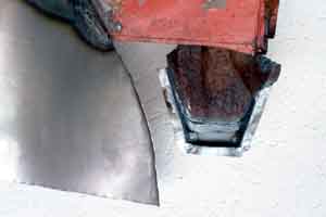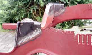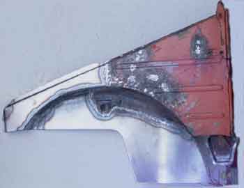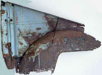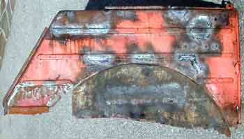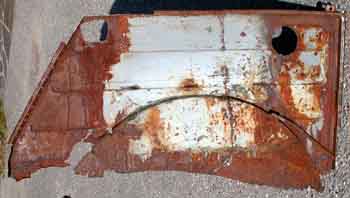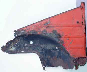 | Das linke vordere Seitenteil der Karosserie sieht schlimm aus, sodass einiges neu gebaut werden muss, unter Erhaltung möglichst vieler Details. | Wofür war dieser durch die Eindrückung oben senkrecht gestellte und mit einem Blech armierte Durchbruch (Durchmesser ca. 40mm) im linken vorderen Radhaus ? | |