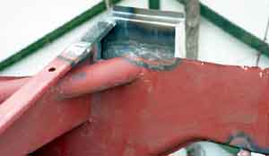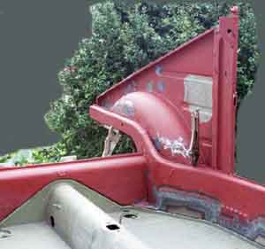 | Der Anschluss des Innenteils der A-Säule am Karosseriegrundrahmen | Das Vorderteil rechts war vom Zustand her besser, der sandfarbene Fleck ist die fast einzige Stelle mit Originalfarbe, hier bei der Anprobe am Karosseriegrundrahmen. |